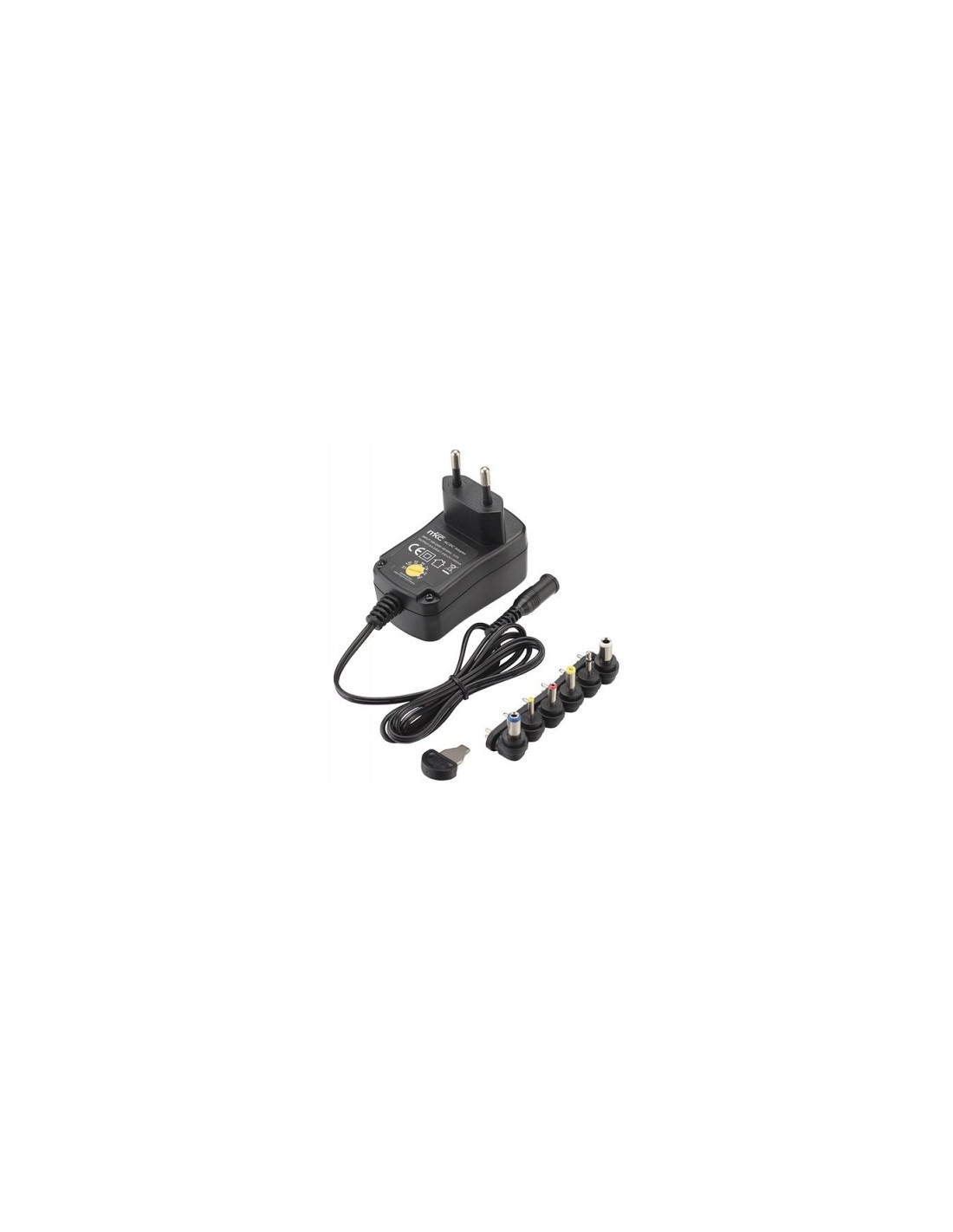 Alimentatore switching ingresso 220-240vca 50/60 hz uscita 3v/4,5v/5v/6v/7,5v/9v/12vdc potenza 600mah n.6 plug in dotazione ;3,5*1,35/5,5*2,1/5,5*2,5/2,35*0,7/4,0*1,7/5,0*1,5mm dimensioni ;70*39*70mm confezione scatola