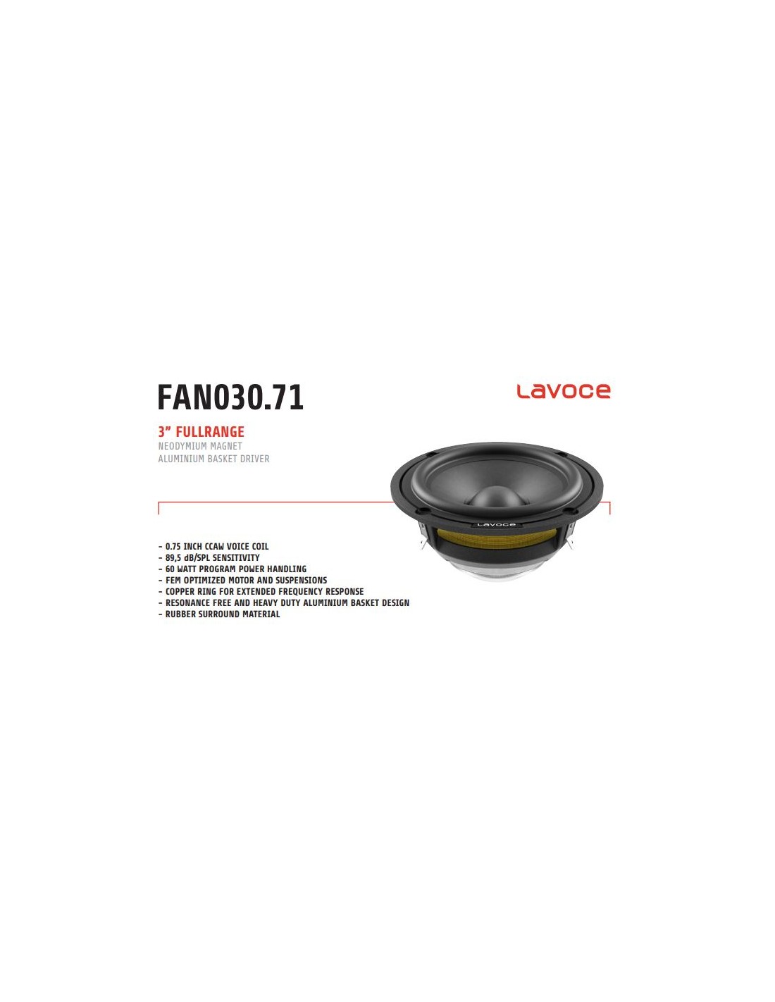LaVoce FAN030.71 Fullrange 78mm (3 pollici) Nom. Ø: 3" - V.C. Ø: 0,7'' - Power handling: 30 W AES / 60 W Program, Sensitivity: 89,5 dB, Frequency range: 120 - 21000 Hz