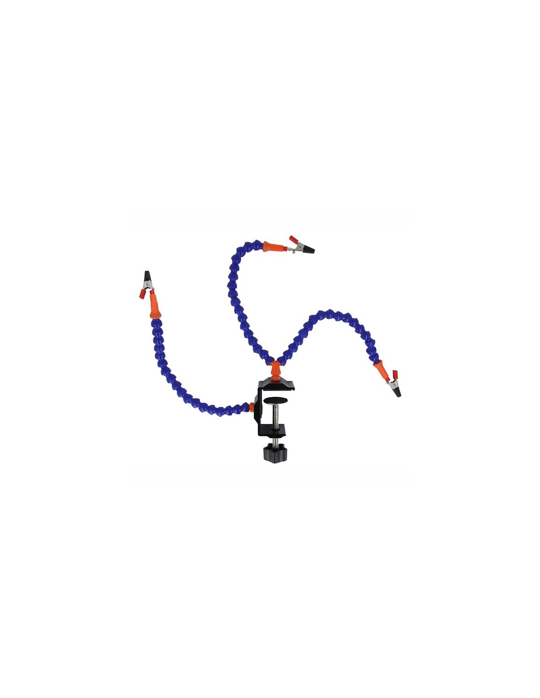 Ha tre bracci flessibili in plastica con morsetti a coccodrillo. Si fissa al piano di lavoro tramite una staffa di montaggio con un morsetto.